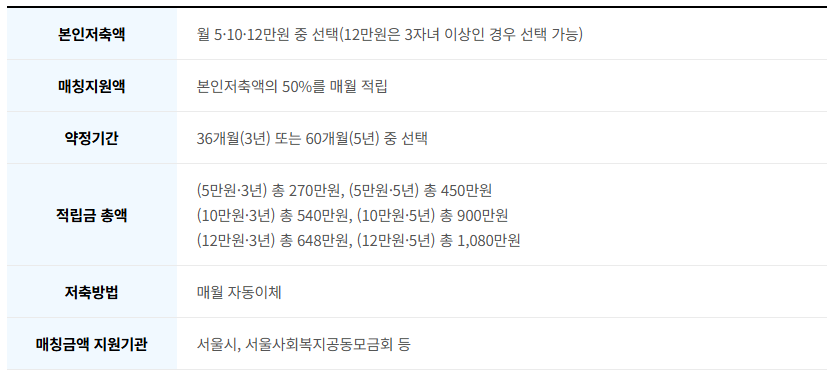 에 가입한 후 3년 또는 5년간 매월 5, 10, 12만원의 금액을 저축하게 되며, 저축한 금액과 동일한 금액 또는 50% 금액을 서울시 예산과 시민후원금으로 추가 적립하여 지원합니다. 연간 300명만 선발되는 한정 재원 사업이기에 지금 바로 준비하세요!