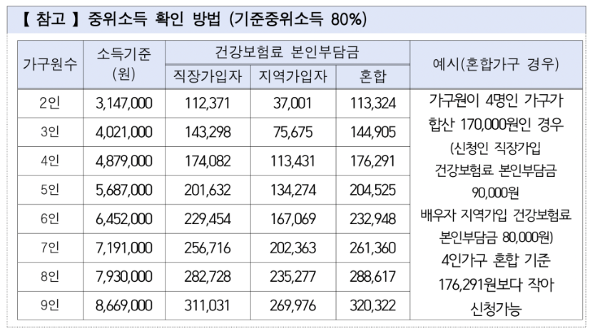 - 기준중위소득 80% 이하, 예: 4인 가구 기준 월 5,687,000원 이하